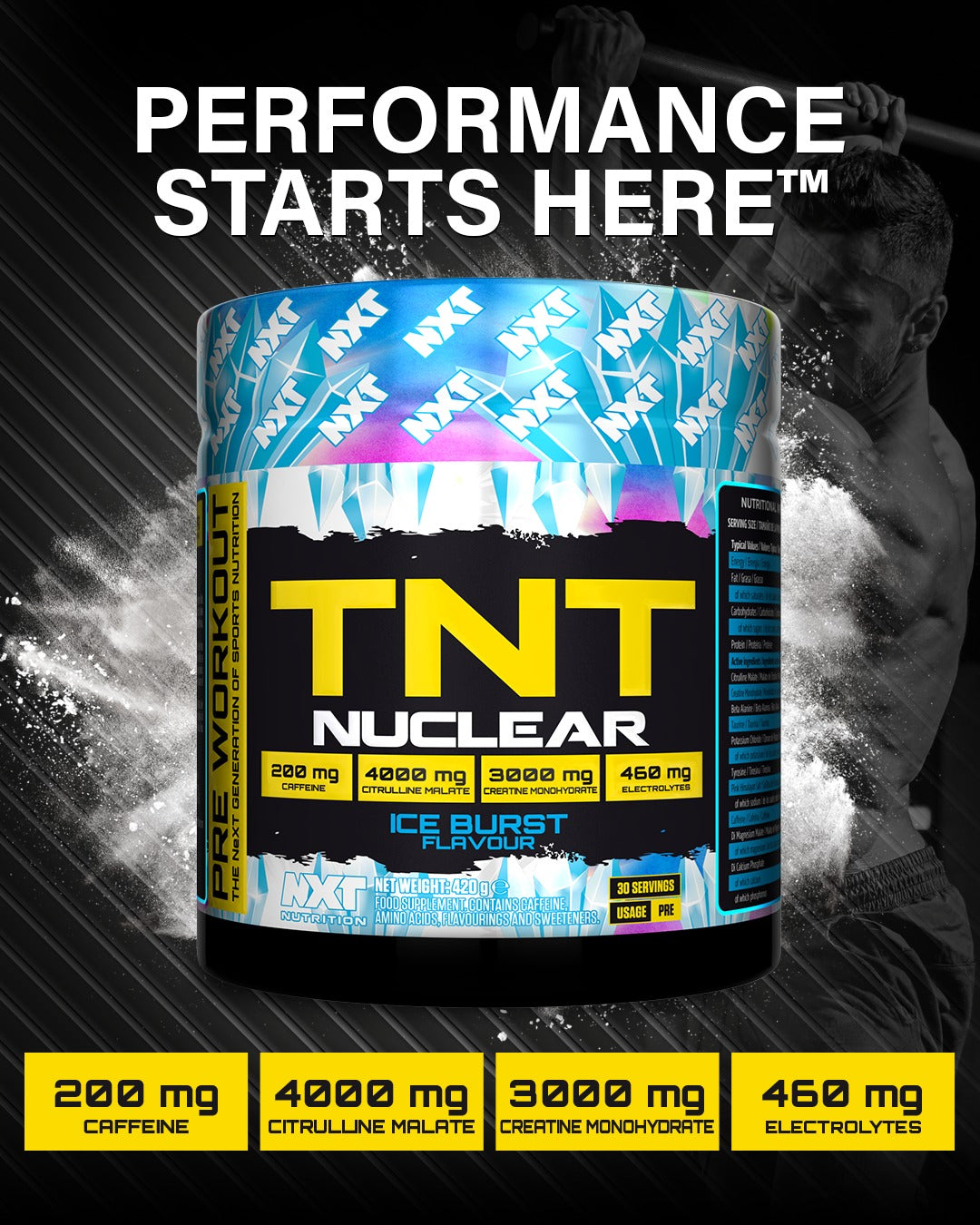 TNT Nuclear is a high-powered pre-workout delivering sustained energy, focus, and performance with a balanced blend of caffeine, creatine, citrulline malate, beta-alanine, taurine, and electrolytes—built to push every session further.