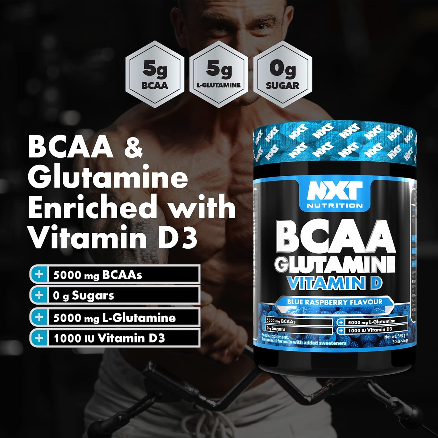 NXT Nutrition’s BCAA, Glutamine & D3 fomula works enhance muscle protein synthesis and improve recovery times with a straightforward inclusion of 5 grams of BCAAs per serving & 5 grams of Glutamine to be taken throughout the course of the day to achieve these goals.